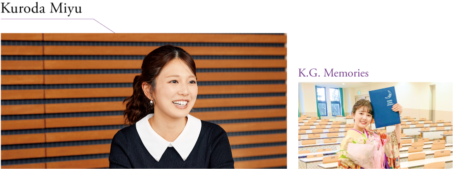 黒田 在学時の学びで特に役立ったのは、スタディスキルセミナーという「読む・書く・話す・聴く」の4技能のレベルアップをめざす授業。学生同士で話し合い、大人数の前で発表する機会が多く設けられていました。人前に出て自分の意見を話すことは、簡単ではありません。だからこそ学生時代から経験を積めて良かったと、アナウンサーになった今実感しています。